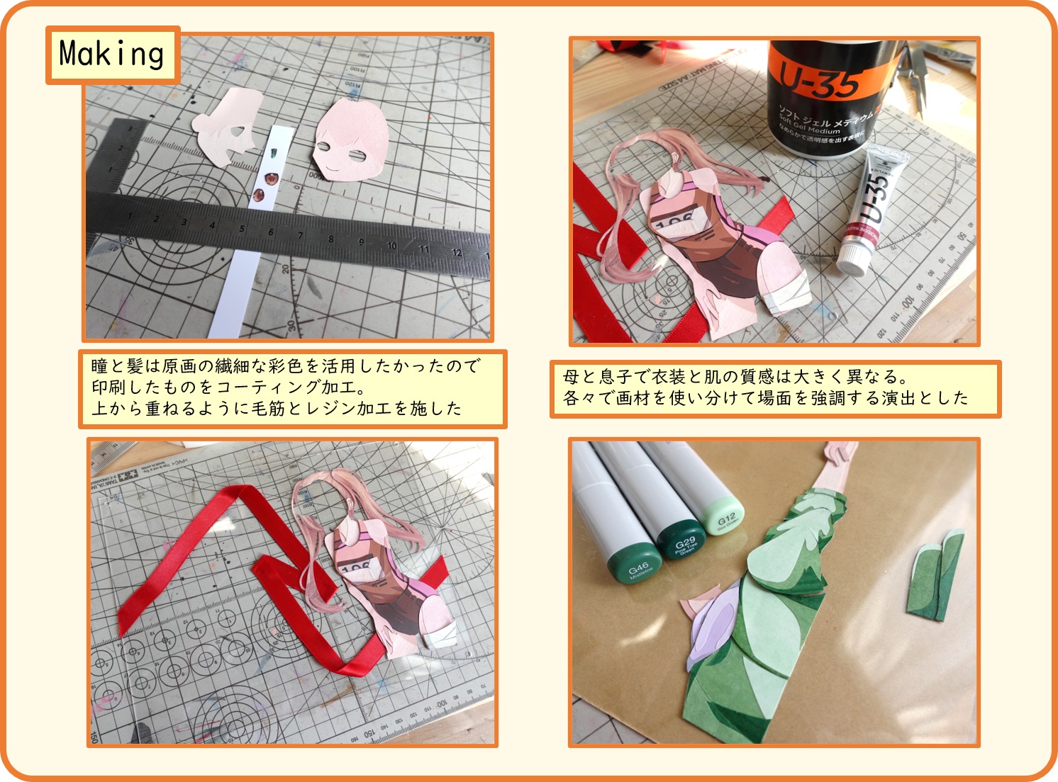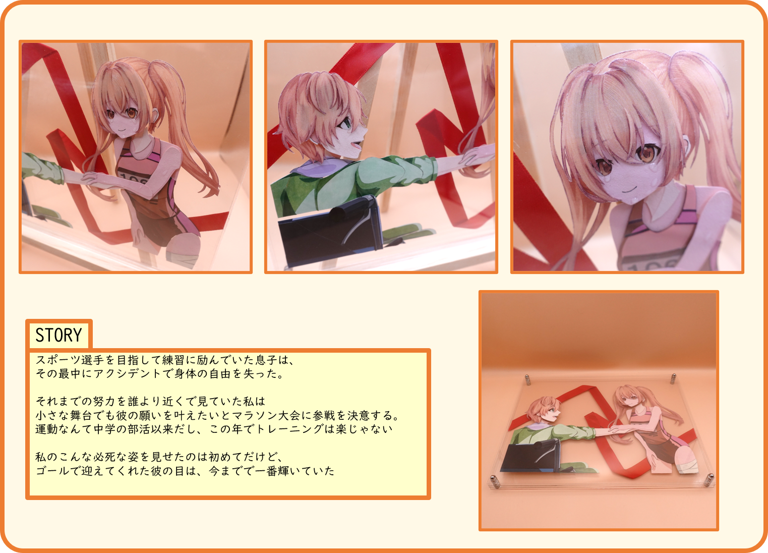 物語を題材にして家族愛を描いた作品。背景のリボンはゴールテープと絆イメージした演出