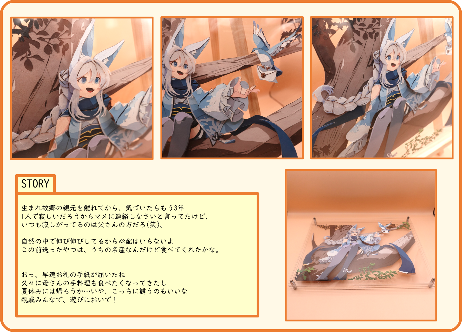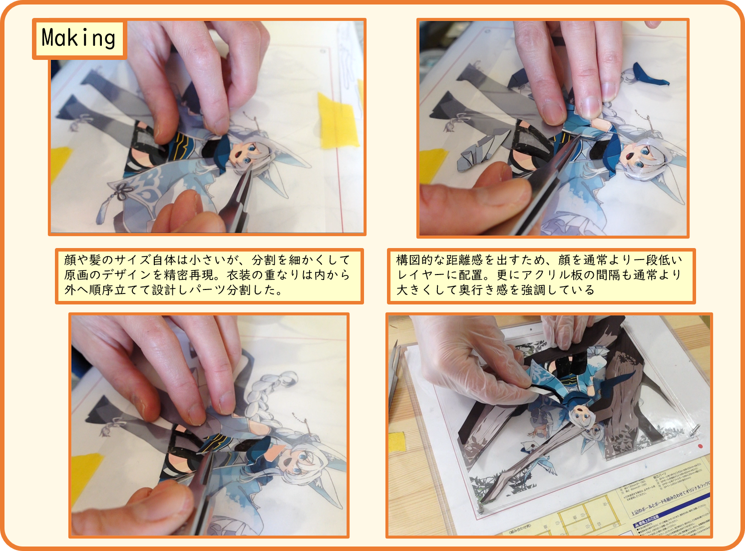 和物衣装は重なりが複雑だが、丁寧に分割して重ねることで精密感が出る。同じレイヤー内でも紙の厚さを変えたのがポイント